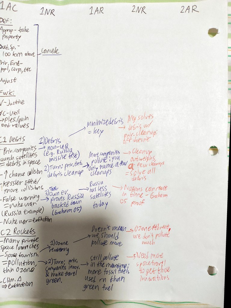 So there it is: flowing! By the end of the debate, your flow sheets should be filled up as shown above (after the 2AR). Don’t worry if it seems all confusing at first. It, again, takes quite a bit of practice to get flowing mastered to the point that you can effortlessly do it and also be able to generate rapid responses in the middle of the round.