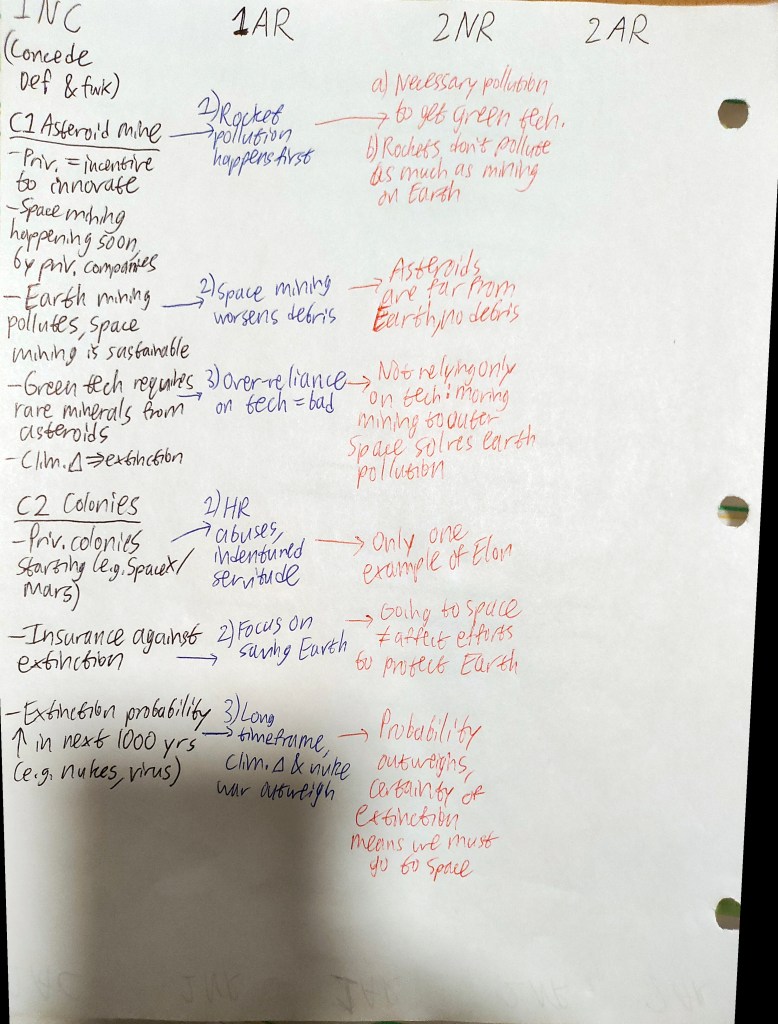 The Neg would take these notes while the Aff is giving the 1AC speech. But the Aff debater can’t take notes at the same time as they’re speaking, so this is where preflowing comes in. Preflowing is exactly as it sounds: it’s basically flowing before you start your speech, hence flowing before the round starts. If you’re the Aff, flow your 1AC around five minutes before your round starts. Same for the Neg: flow your 1NC even before the Aff starts their speech (five minutes before round start), so that you don’t waste precious in-round prep time.