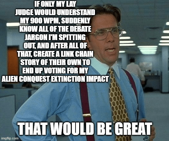 There are a few common broad categories or stereotypes of judges – no one should take offense as they’re purely extremes that debaters sometimes refer to. Your judges oftentimes don’t fall into just one of these categories (so don’t talk about your judge being “trad” or “lay” right in front of their faces) – in fact, they may fall into none of them – but in the end, remember to respect all your judges, as they’re putting in much hard work, sacrificing their weekend to help keep debate as a lively activity!