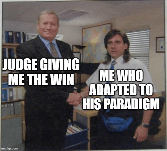 Overall, try to read through the entirety of your judge’s paradigm for accurate understanding! You can get a vague idea of how your judge fits into this pseudo-spectrum based on clues in their paradigm. For example, some beginner judges will humbly indicate their lack of participation in judging, or may not even have a paradigm in the first place. Meanwhile, experienced judges usually list their qualifications or summarize their history with debate. Progressive judges frequently will include specific paradigm details about progressive arguments, such as theory, kritiks (“K”s), and counterplans (“CP”s).