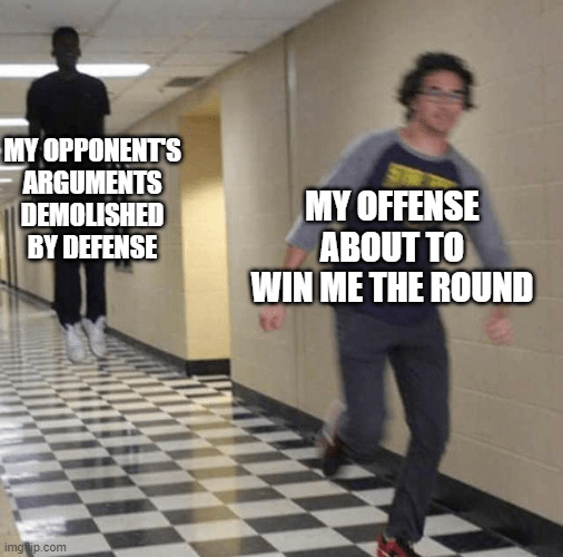 Comparing these extremes in a debate context, having zero defense but a bunch of offense means that you might just win, as there are reasons to vote for you, although it would be quite difficult to do so. But on the other hand, having zero offense and 100% defense is not sufficient to win, as you are only proving to your judge that they shouldn’t vote AGAINST you: there aren’t actual reasons to vote FOR you. This doesn’t mean that you should only focus on offense: both types of arguments are important to helping you win.